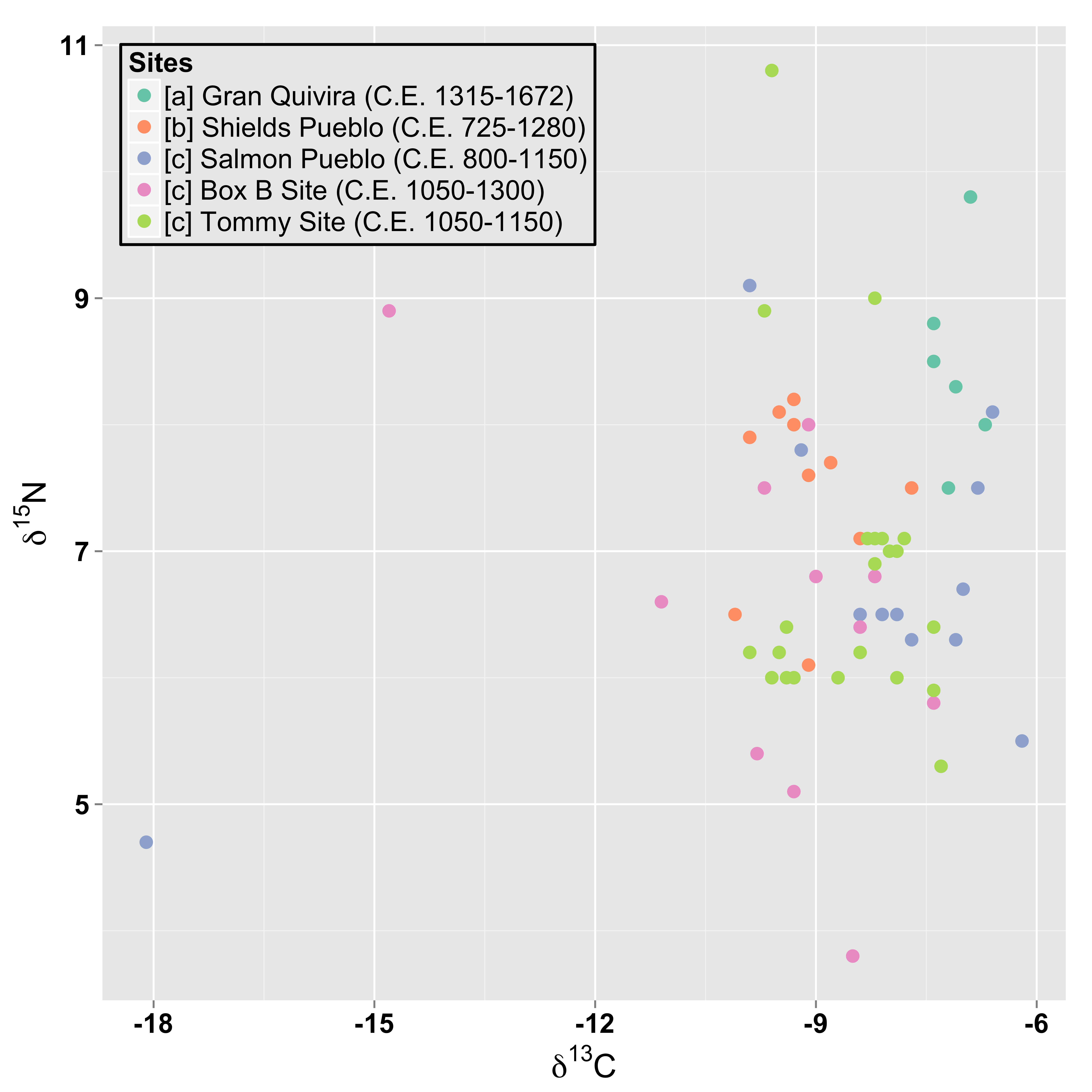 ![Figure 2. Bone collagen data from turkeys in five different sites throughout the American Southwest. Note range of dates and cluster of isotope data near -12‰, suggesting a predominantly maize diet. [a]-Kellner et al. 2010 [b]-Rawlings and Driver 2010 [c]-McCaffery et al. 2014](https://zooarchisotopes.com/wp-content/uploads/2015/05/fig-2.png?w=300&h=300)