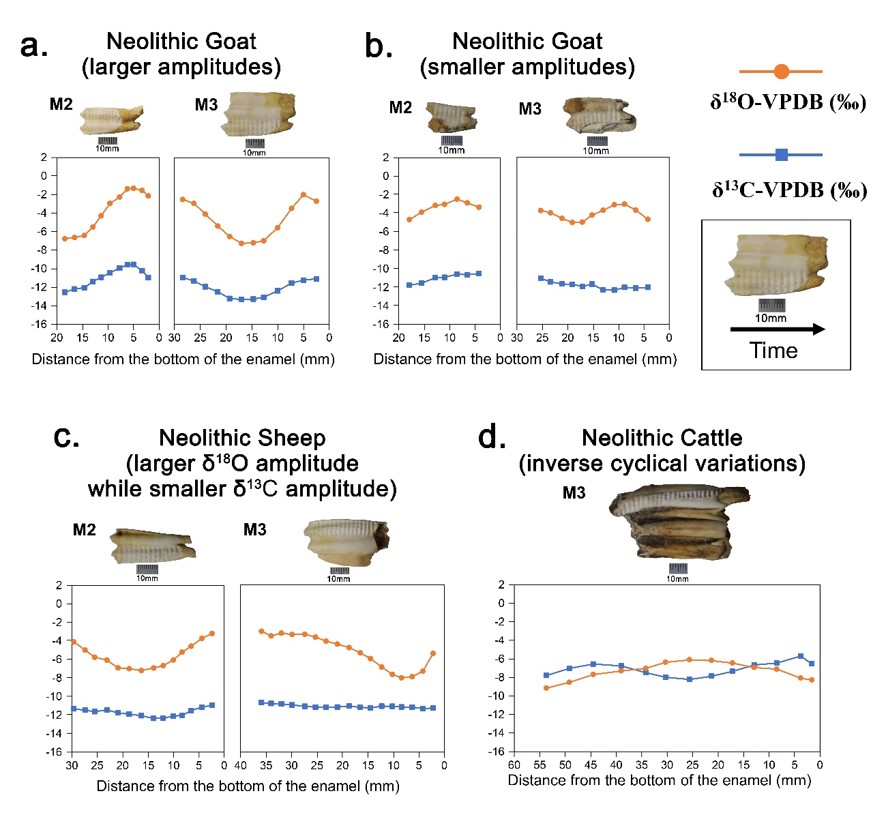 - A Neolithic goat and three Neolithic cattle samples exhibited relatively small amplitudes and/or inverse cyclical variation patterns (figure b and d). While these patterns may have been caused by multiple factors, such as drinking water and food/fodder, vertical transhumance has also been proposed to result in the similar isotope patterns (e.g., Henton et al., 2010; Tornero et al., 2016). If animals experience seasonal vertical transhumance between lowlands in winter and highlands in summer, it is expected that the δ13C fluctuation range reduces. In addition, the δ13C value of C4 plant feeders is presumed to decrease if they spend summer in highlands where C4 plants are less.