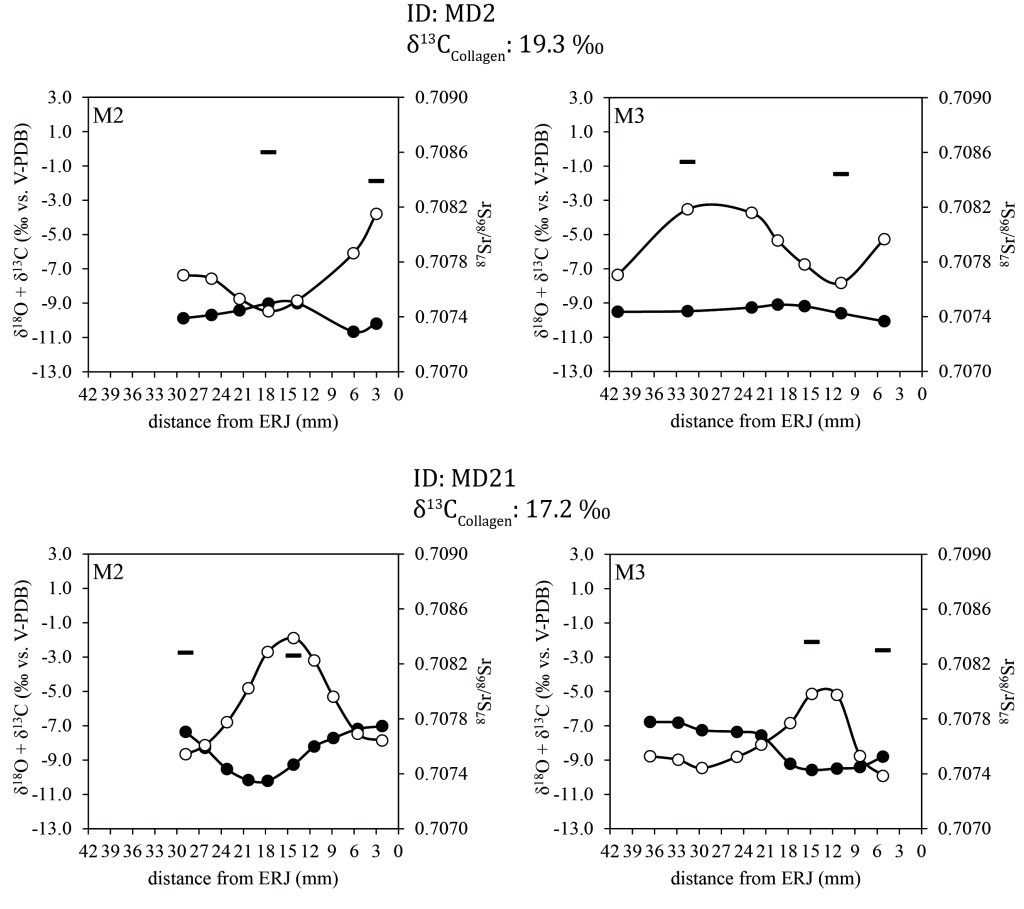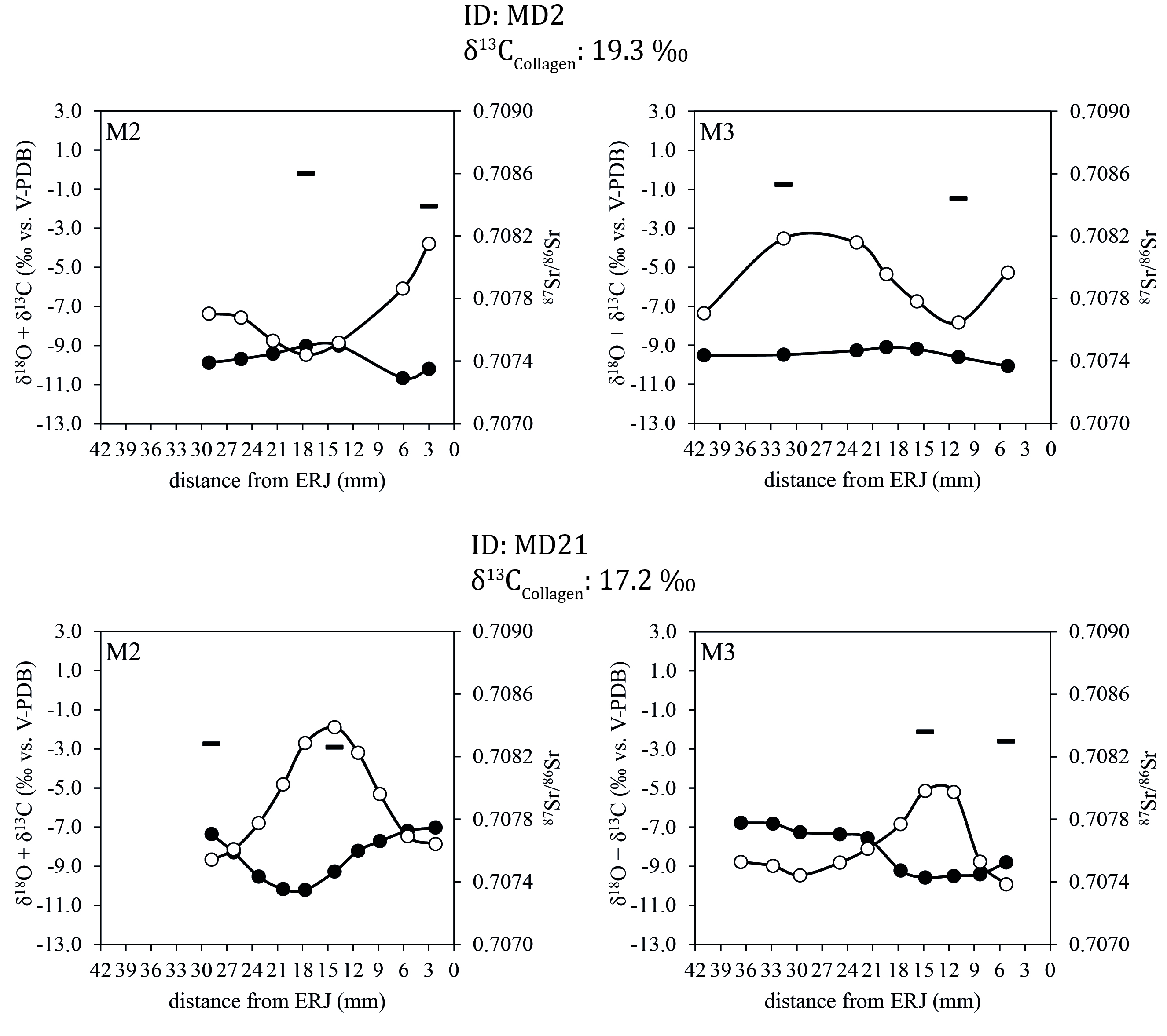 In a third step, the δ18O sequences obtained from the teeth were used to assess strontium isotope analysis. From each tooth two sample positions of the highest and lowest δ18O values were selected to measure the strontium ratios (87Sr/86Sr) to investigate the possibility of different grazing locations on a seasonal scale. The δ18O sequences were further used to provide information about the birth seasonality in the Monjukli herd population.